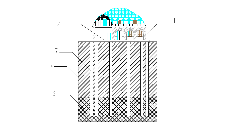 在既有建筑物下方興建地下室時,需要增設新的樁基礎支撐上部建筑物,才可開挖建筑物下方的土方,最后施工地下室。本工程采用泥漿護壁灌注樁鉆孔,采用了48根直徑146mm,壁厚12mm的無縫鋼管作為建筑物的支撐。鋼管長度約24-26m,進入風化巖5m左右。為保證鋼管穩定性,每開挖2.5m焊接拉結支撐一道。該地下增層方法在國內尚屬首例,并申請了國家專利。