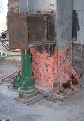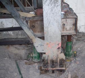 由于礦井凍結法施工造成后期井口附房產生較大沉降,影響了上部結構的使用。采用頂升法對鋼結構廠房中的沉降較大的鋼柱進行糾偏,該方面需要在鋼柱腹板上焊接鋼牛腿提供頂升支點,同時對鋼柱底部預埋的螺栓桿體加長,每個鋼柱兩側設置兩個頂升千斤頂,經過頂升糾偏后該鋼結構廠房基本恢復原狀。